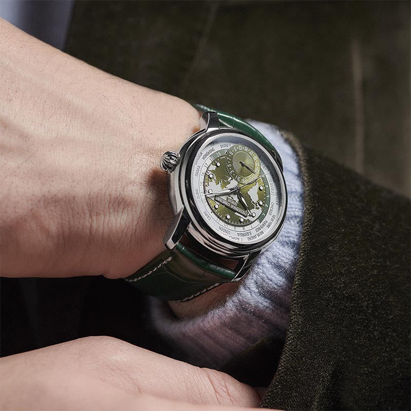 Frederique Constant Manufacture Worldtimer 42mm stainless steel automatic watch featuring a green embossed sunray dial. Presented on a green alligator strap. Water resistant to 50m. Sapphire crystal.