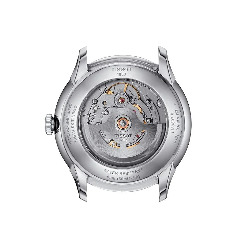 Tissot Chemin des Tourelles Powermatic 80 39mm stainless steel automatic watch featuring a grey dial with date display and is presented on a see through caseback steel bracelet with butterfly clasp and push buttons. Water resistant to 5 bar (50m/165ft). Sapphire crystal.