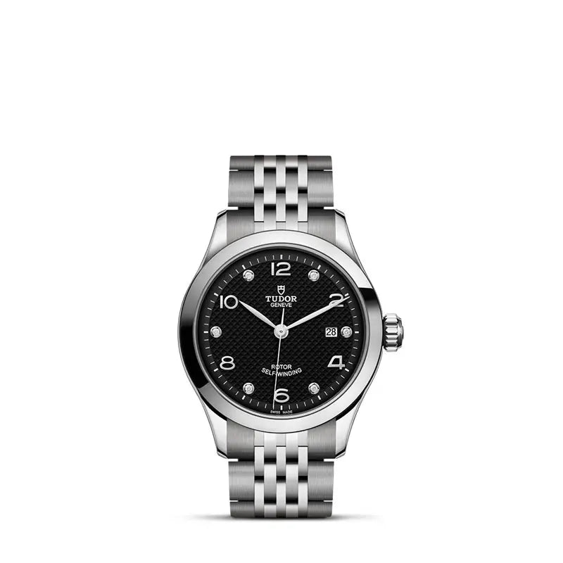 28 mm steel case with polished finish. Self-winding mechanical movement, Calibre T201. Smooth steel bezel with polished finish. Black, embossed decoration, domed dial with 6 diamonds. Steel screw-down winding crown with the TUDOR logo in relief. Sapphire crystal. Waterproof to 100 m (330 ft). Steel bracelet, 7 rows, satin-brushed external links, polished centre links, with folding clasp and safety catch