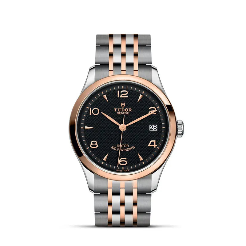 36 mm steel case with polished finish. Self-winding mechanical movement, Calibre T601. Smooth bezel in rose gold, with polished finish. Black, embossed decoration, domed dial. Steel screw-down winding crown with the TUDOR logo in relief. Sapphire crystal. Waterproof to 100 m (330 ft). Steel and rose gold bracelet, 7 rows, satin-brushed external links, polished centre links, with folding clasp and safety catch