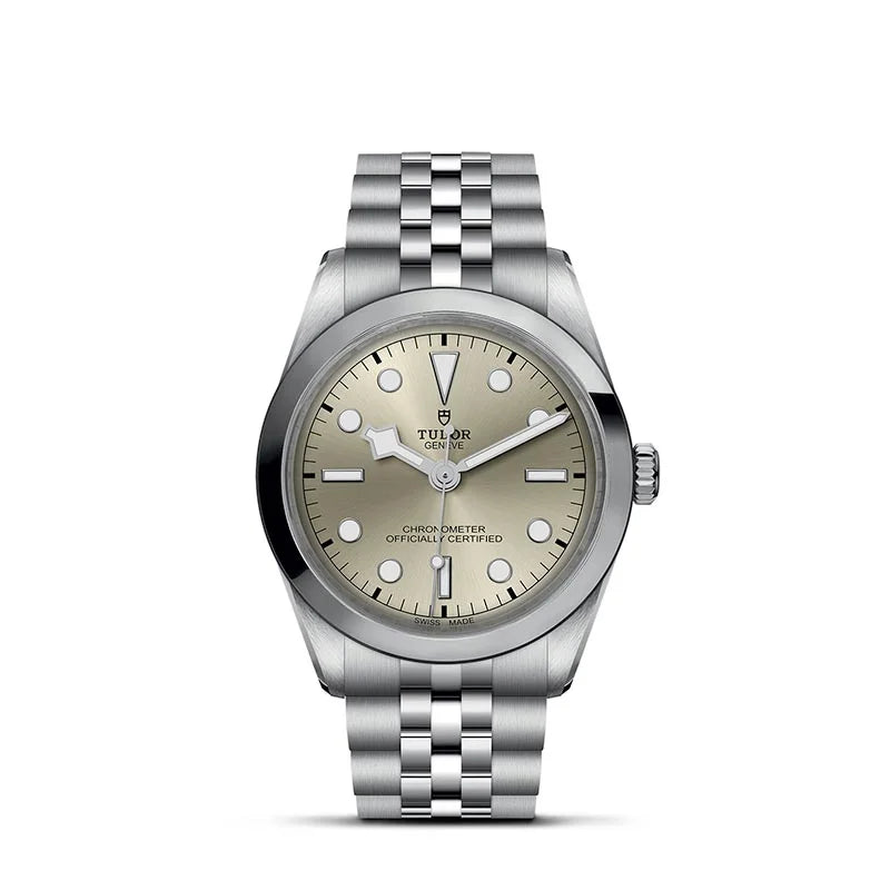36mm steel case with polished and satin finish. Manufacture Calibre MT5400 (COSC) Self-winding mechanical movement with bidirectional rotor system. Stainless steel bezel with polished and satin finish. Light champagne-colour dial. Screw-down crown with the TUDOR rose in relief. Flat sapphire crystal. Waterproof to 100m (330 ft). Stainless steel bracelet, polished and satin finish, with TUDOR “T-fit” folding clasp and safety catch.